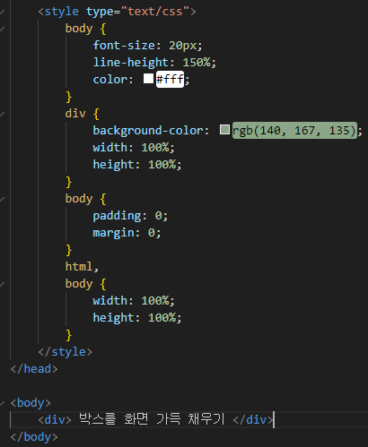 - <div> 에 width, height 를 100% 로 부여하기 위해서는 <div>의 부모요소에 크기를 부여해야 기준으로 삼을 수 있다.