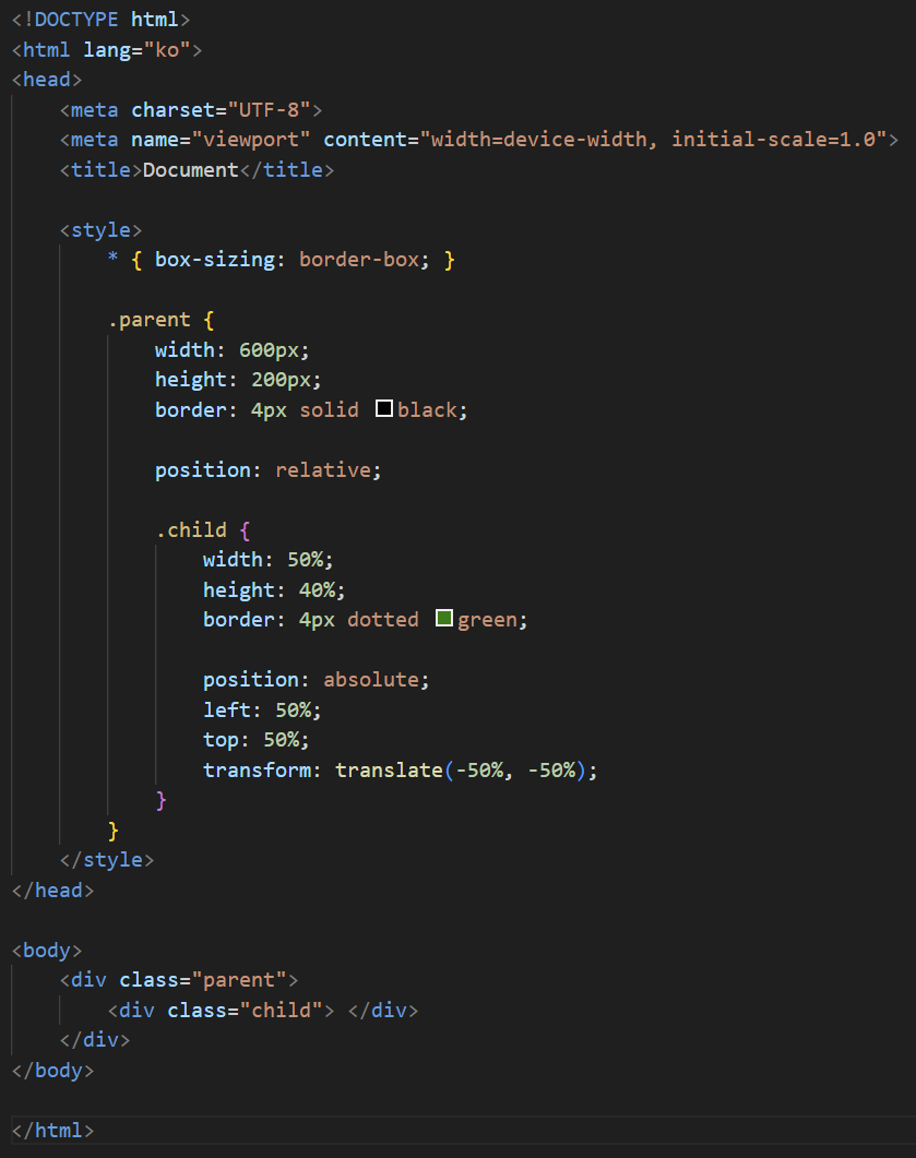 2) 자식 요소 너비의 50% 만큼 왼쪽, 위쪽으로 이동