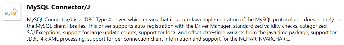 - MySQL Connector/J는 최신 JDBC 표준(현재 JDBC 4.2)까지 지원하며, 기본적인 데이터베이스 연결뿐만 아니라 메타데이터 검색, 배치 업데이트, 트랜잭션 관리 등 다양한 기능을 제공한다