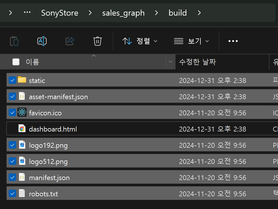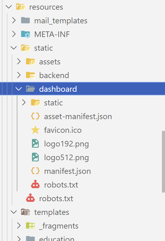 ✅ dashboard 폴더 안에 yarn build 후 생성된 파일 중 html 파일 제외하고 모두 복사