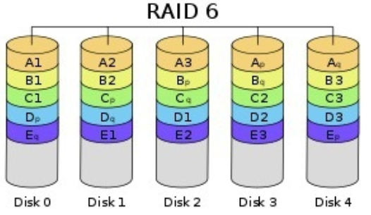 - RAID 5와 유사하지만, 추가적인 패리티 블록을 사용하여 최소 4개의 디스크로 구성된다