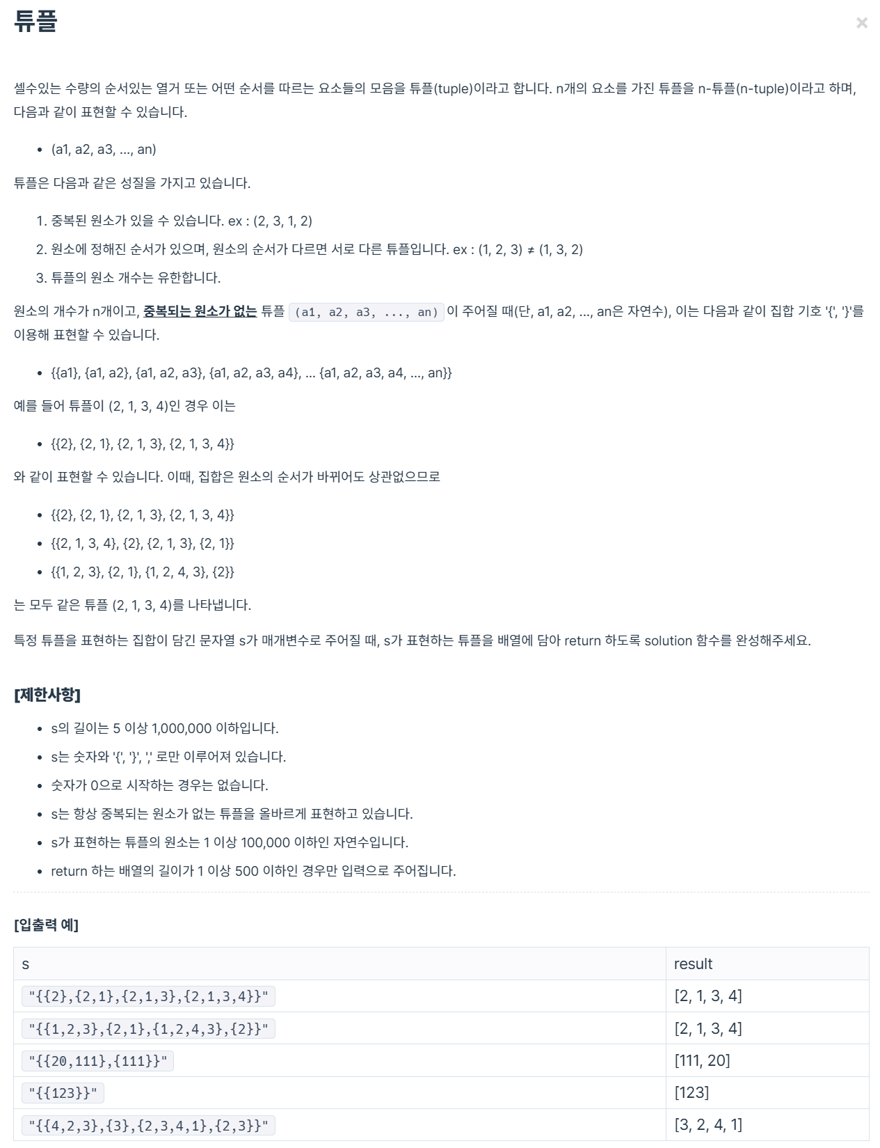 1. 문자열 파싱: {{2},{2,1},{2,1,3},{2,1,3,4}} → [[2], [2,1], [2,1,3], [2,1,3,4]] 형태로 바꾸기