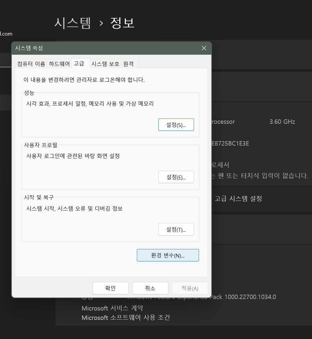 ▷ 내PC 우클릭 > 속성 > 우측에 고급시스템설정 > 고급 > 환경변수 > 시스템변수 >