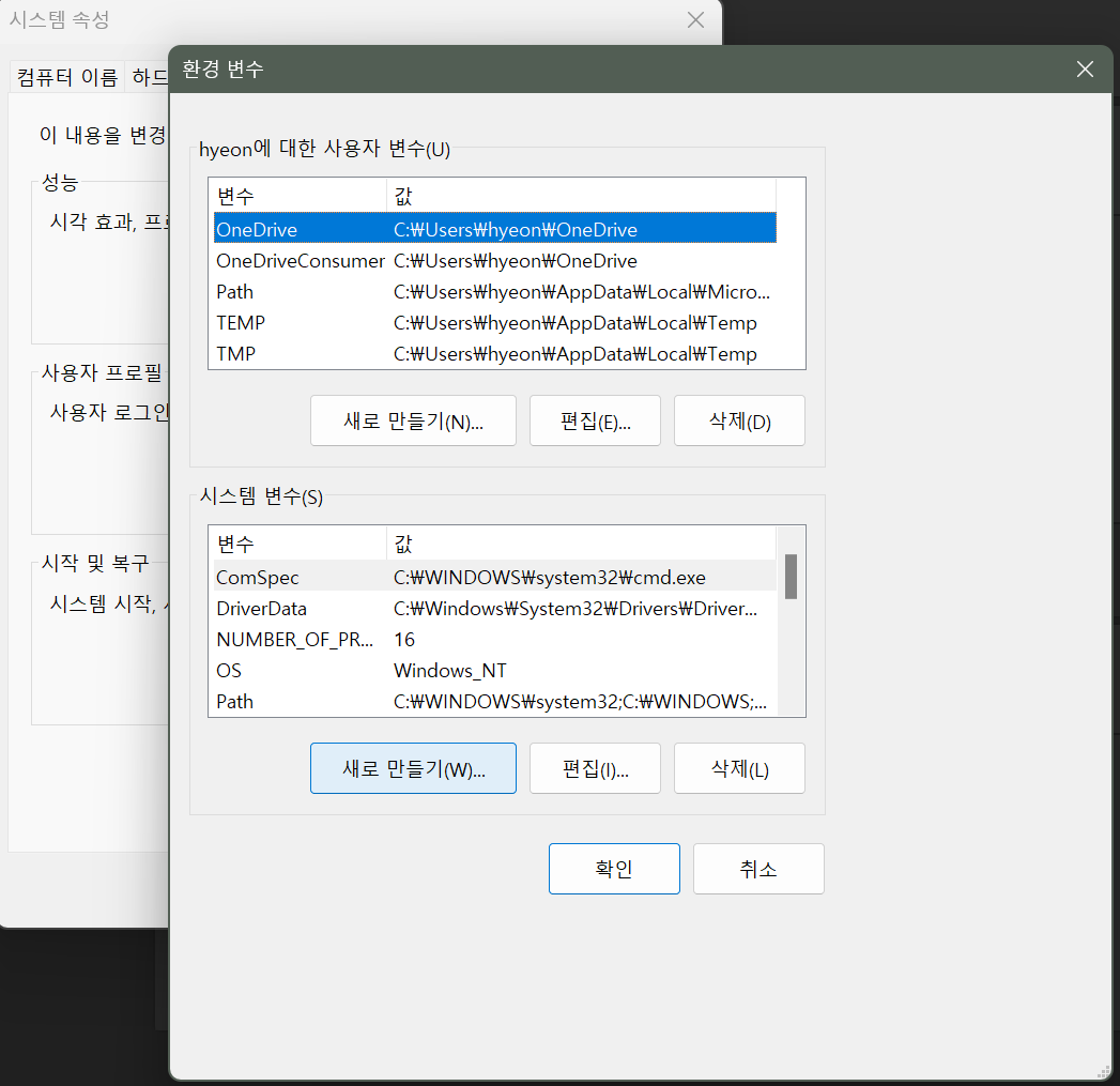 환경 변수 편집화면 우측의 새로 만들기 버튼 클릭