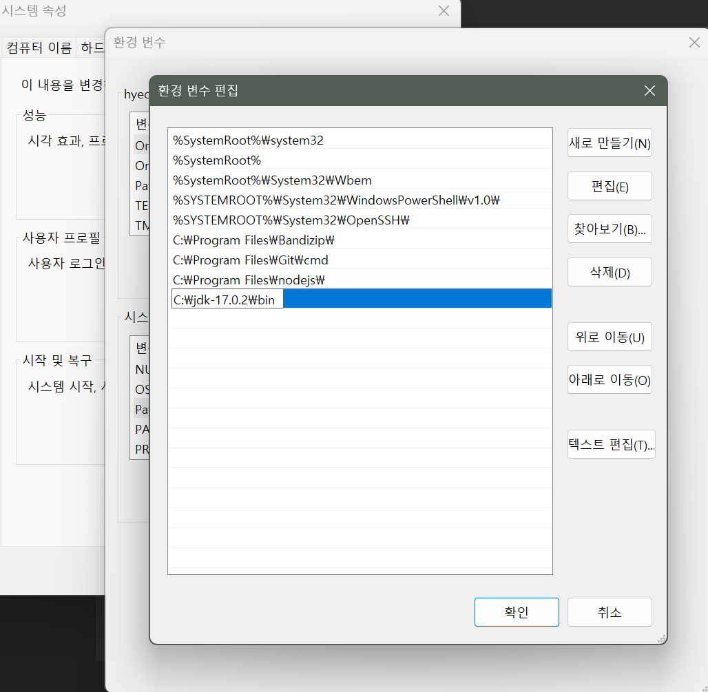 새로 생성된 입력 칸에 C:\jdk-17.0.2\bin이라고 입력
