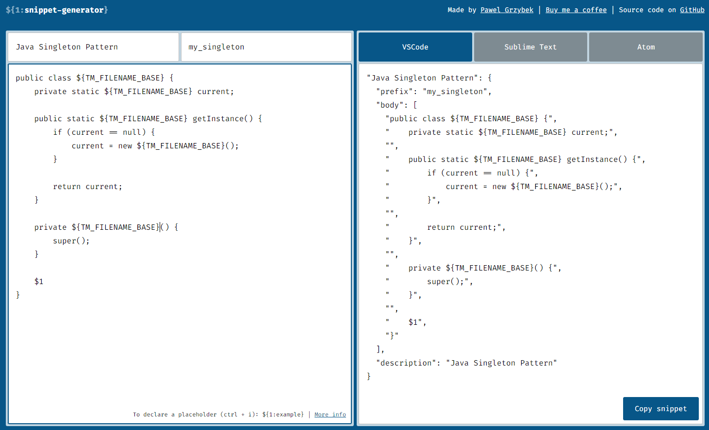 https://snippet-generator.app/?description=&tabtrigger=&snippet=&mode=vscode
